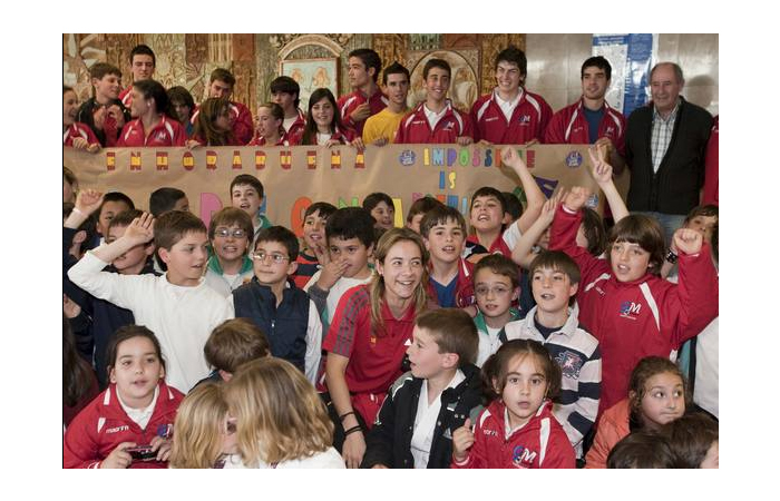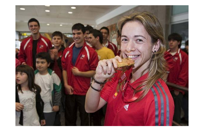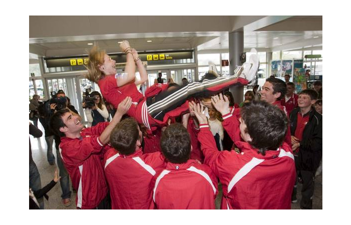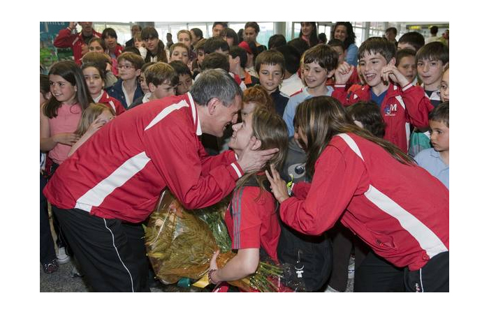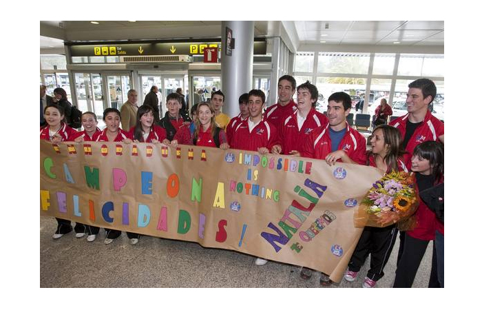 La deportista cántabra Natalia García, flamante campeona de Europa absoluta de kárate en la categoría de -50 kilos, ya está en casa. La campeona continental llegó con su reluciente medalla de oro al cuello y fue recibida en el aeropuerto de Parayas con una calurosa bienvenida que prepararon su entrenador y sus compañeros del gimnasio González Machín, a la que se unieron algunos familiares y amigos. Natalia no se esperaba ningún recibimiento, por lo que cuando atravesó la puerta de la terminal de llegadas y se encontró con casi 80 personas, entre ellas 40 niños del gimnasio, que coreaban su nombre, cámaras de televisión y fotógrafos de prensa, se puso más nerviosa que en la mismísima final del sábado en Zagreb. La bienvenida fue de las que emocionan. Hubo ramos de flores; una pancarta en la que se podía leer 'Bienvenida Campeona. Impossible is nothing' (nada es imposible); besos; abrazos de sus amigas Carmen, Esther, Lourdes y Lucía; felicitaciones, un manteo y fotos para la posteridad. Natalia, sin parar de sonreír y dejando a un lado su timidez, posó con todos sus compañeros, con su entrenador y hasta se atrevió a morder la medalla al más puro estilo Nadal. La ocasión lo merecía.